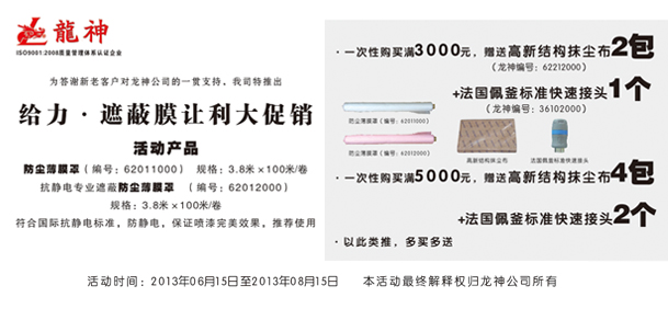 一次性購買滿5000元,贈送高新結(jié)構(gòu)抺塵布(龍神編號:62212000)4包+法國佩釜標(biāo)準(zhǔn)快速接頭(龍神編號:36102000)2個(gè)