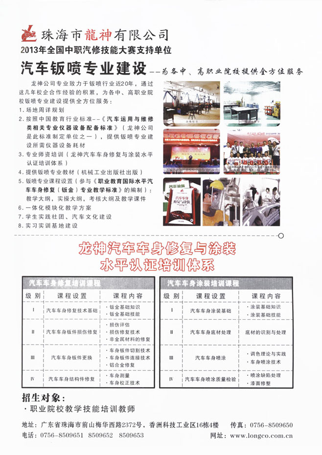 龍神公司專業(yè)致力于鈑噴行業(yè)近20年,通過這幾年校企合作經(jīng)驗的積累,為各中、高職業(yè)院校鈑噴專業(yè)建設(shè)提供全方位服務(wù):