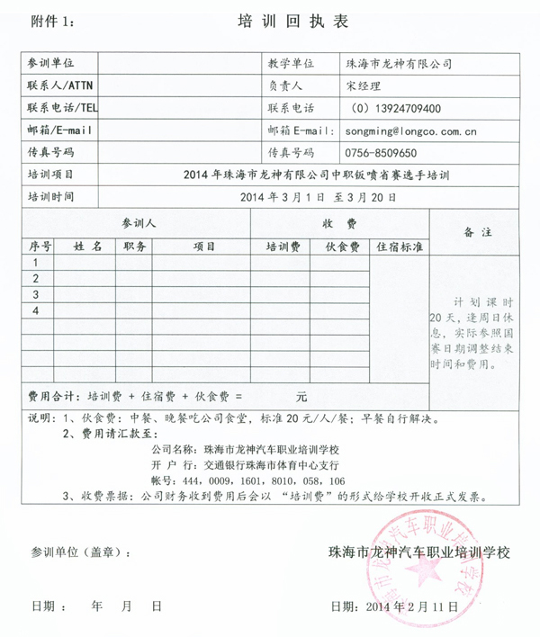 2014年度珠海市龍神有限公司中職鈑噴大賽選手培訓方案