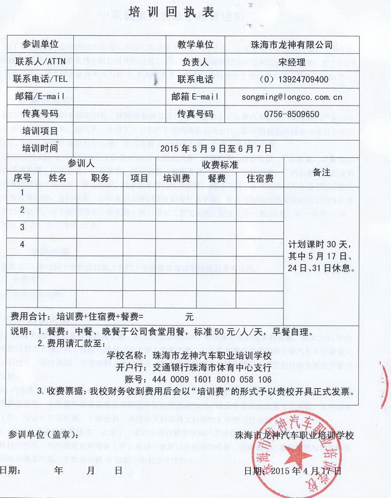 培訓(xùn)時間30天,即從2015年5月9日起至6月7日止,其中5月17日、24日31日休息;期間餐費按照上課時間27天預(yù)收,實際參照離開時間調(diào)整。具體收費情況請來電咨詢。